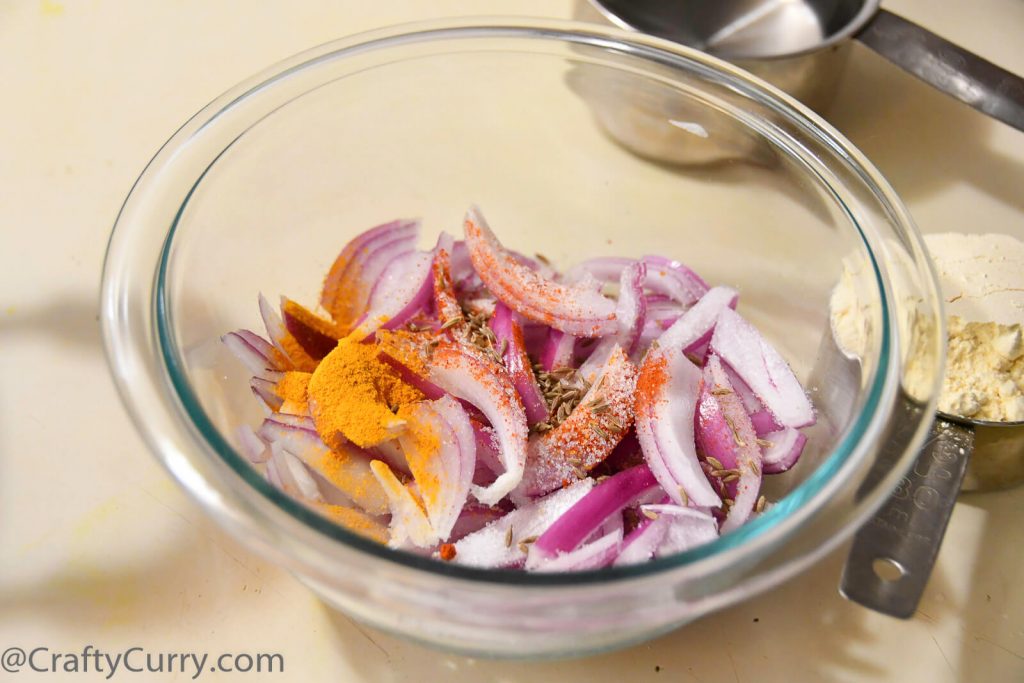 1. Add red chili powder, salt, cumin seeds and turmeric powder to thinly sliced onions and mix it in a bowl.